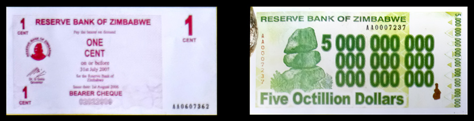 | Hier mal was anderes: Hatte ein Plakat mit allen Geldscheinen gesehen die Simbabwe so in den letzten Jahren hervor gebracht hat. Hier mal die kleinste und wenige Jahre später grösste Banknote die je gedruckt wurde. Allerdings kann man nicht von erwachsen werden sprechen. Der Wert liegt bei Null. Zimbabwe Dollar ist out, US Dollar in. So gibt es an den Bankautomaten nur noch US$. Zusätzlich kann, wie in allen an Südafrika grenzenden Ländern, mit südafrikanischen Rand bezahlt werden. Eine Dose Cola kostet z.B. acht Rand oder 1 US$ und 2 Rand. |