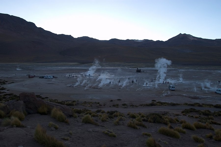 | Frühmorgens die Geysire von El Tatio in 4300 m Höhe bei Minus 10 Grad C. Für diese Tour muss man sich schon um 3 Uhr Nachts auf den Weg machen. | |