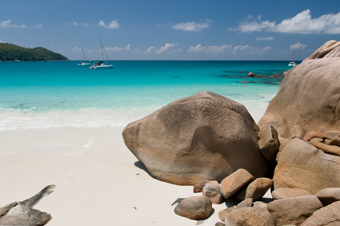 | Das fuer mich typischste Bild der Anse Lazio auf Praslin. Aufgenommen von einem Felsen als erhoehten Standpunkt. Im Hintergrund rechts der Bereich zum Schnorcheln. | ||||||||||||